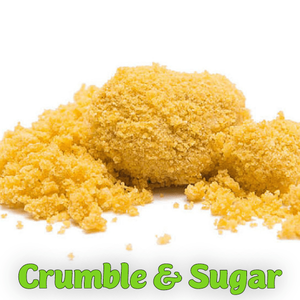 Crumble looks a lot like tiny clumps of sugar, but it is pretty dry and easy to handle. Crumble is perhaps the driest form of cannabis concentrate you can find, which makes it ideal for sprinkling on a rolled joint. Crumble can also be vaporized on a rig or dab setup as well. Cannabis sugar is similar to crumble, but is slightly wet, which means it is best used with a vaporizer.